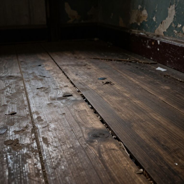 Cracks appearing on the surface of an old abandoned wooden floor, dark shadowy room setting, worn textures and peeling paint, cinematic lighting illustrating decay and history in high detail