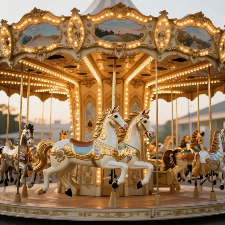 The image showcases an ethereal antique carousel bathed in a soft, golden light that creates a dreamlike atmosphere. The carousel, with its intricate and ornate design, features two prominent horses in mid-gallop, their bodies adorned with detailed brass and gold accents. The horses are positioned in the foreground, with their muscular forms and flowing manes captured in a hyperrealistic manner. The carousel itself is a masterpiece of craftsmanship, with its circular structure adorned with decorative elements and illuminated by numerous small lights that cast a warm glow. The background is softly blurred, emphasizing the carousel and its horses, and the overall composition is balanced, with the carousel centrally positioned and the horses slightly off-center, creating a sense of movement and dynamism. The image exudes a sense of nostalgia and wonder, evoking a feeling of magic and enchantment.