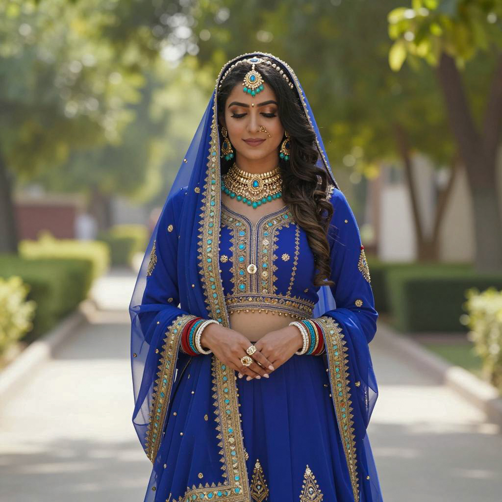Blue arabian princess, photograph of a beautiful Indian woman, standing on a sunny path, wearing a blue traditional dress with gold and turquoise embroidery, blue headscarf with a gold and turquoise headpiece, matching jewelry, green trees in the background, soft natural light, daytime, blurred greenery in the background, realistic, portrait, detailed, traditional attire, elegant, traditional Indian fashion, serene expression, hands gently clasped in front, lush garden setting