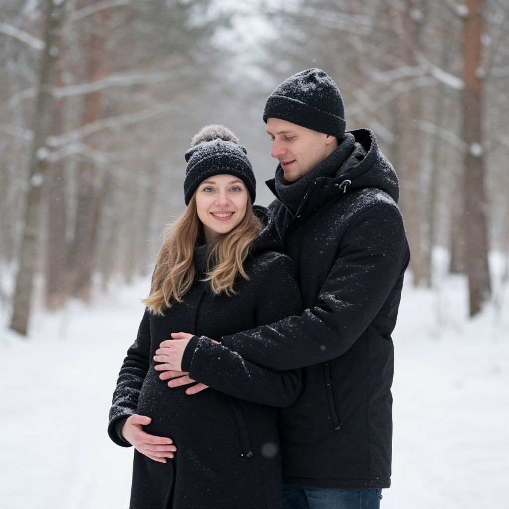 Snowflakes gently fall as a smiling couple stands embraced in a serene winter forest, the woman's hands cradling her belly while the man's arm rests protectively around her, both dressed warmly in black outerwear against the frosty backdrop.
