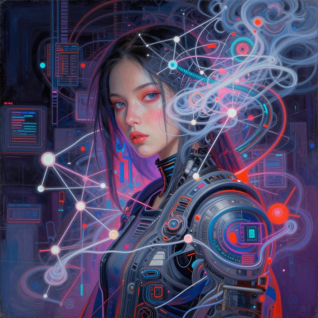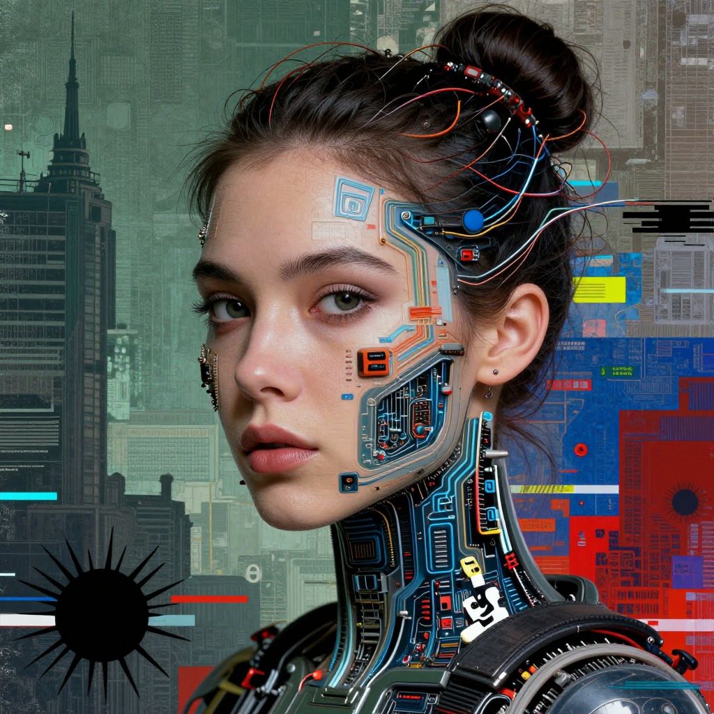 Cute punk goth fashion fractal mecha girl wearing a television tube helmet and kimono made of circuits and leds, surreal dada collage by man ray kurt schwitters hannah hoch alphonse mucha beeple
