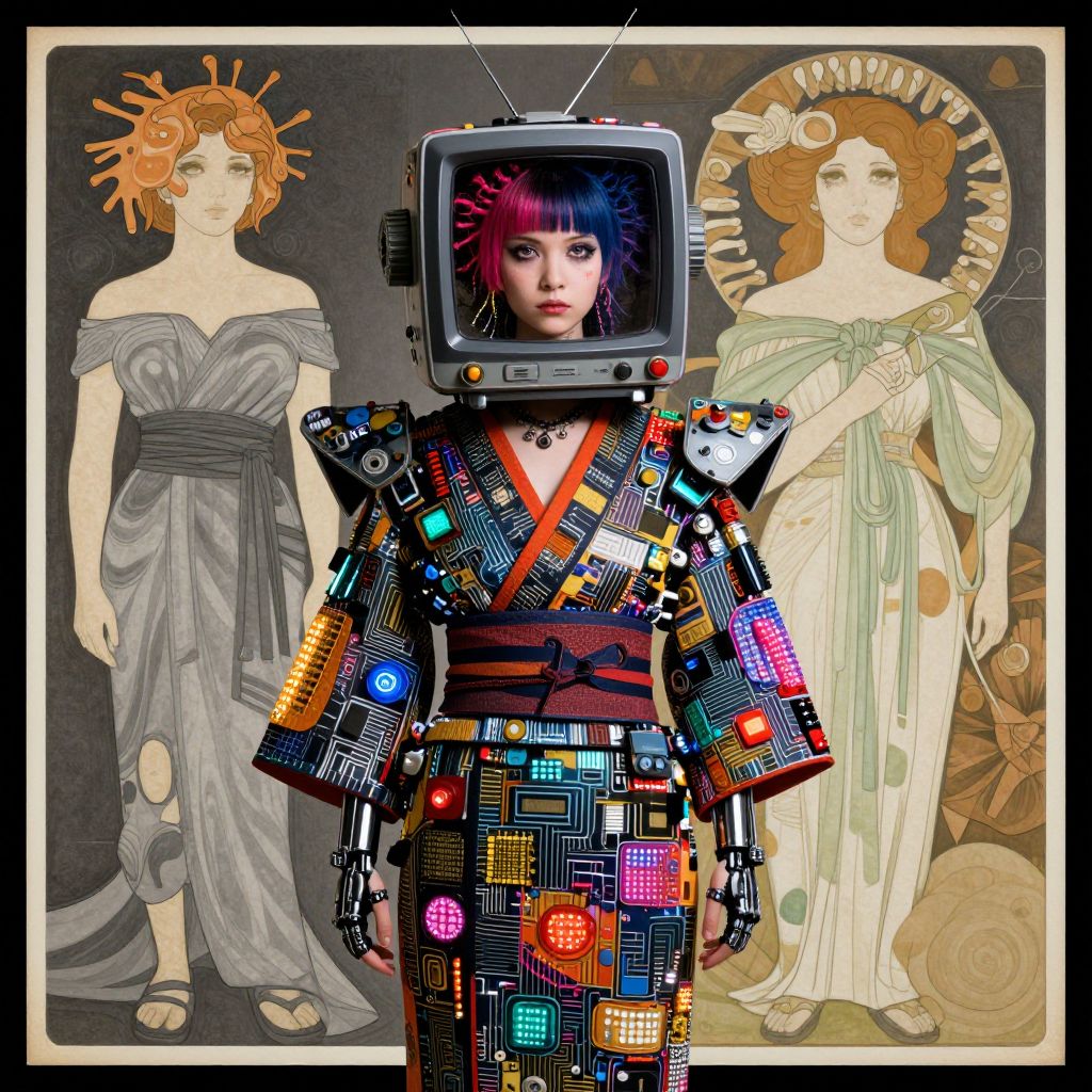 Digital artwork: Cyberpunk woman with TV head, colorful patchwork kimono, flanked by two Art Nouveau-style women in flowing dresses.