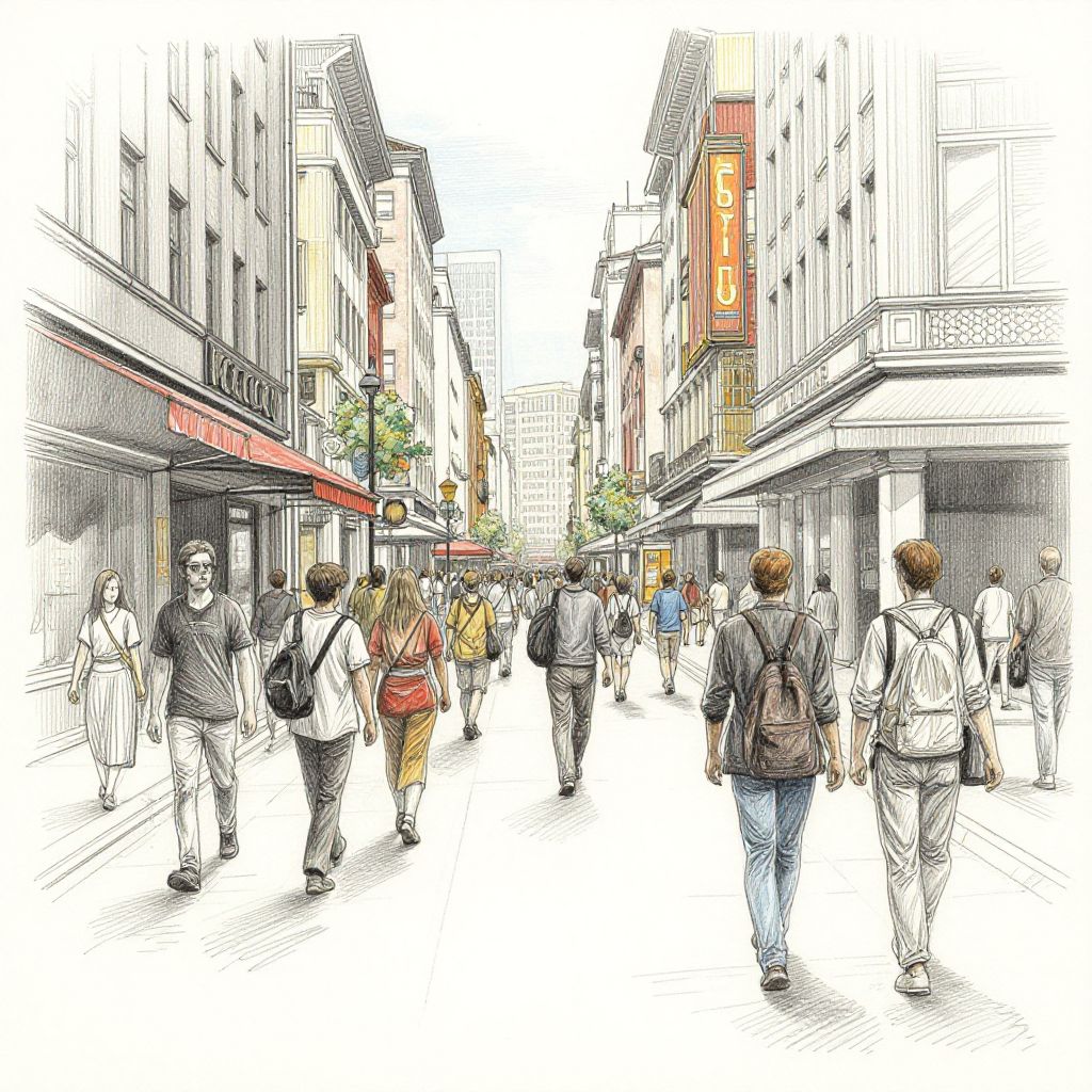 Illustration of a bustling city street with diverse pedestrians, wearing casual clothes, walking between tall, detailed buildings with storefronts and signs.