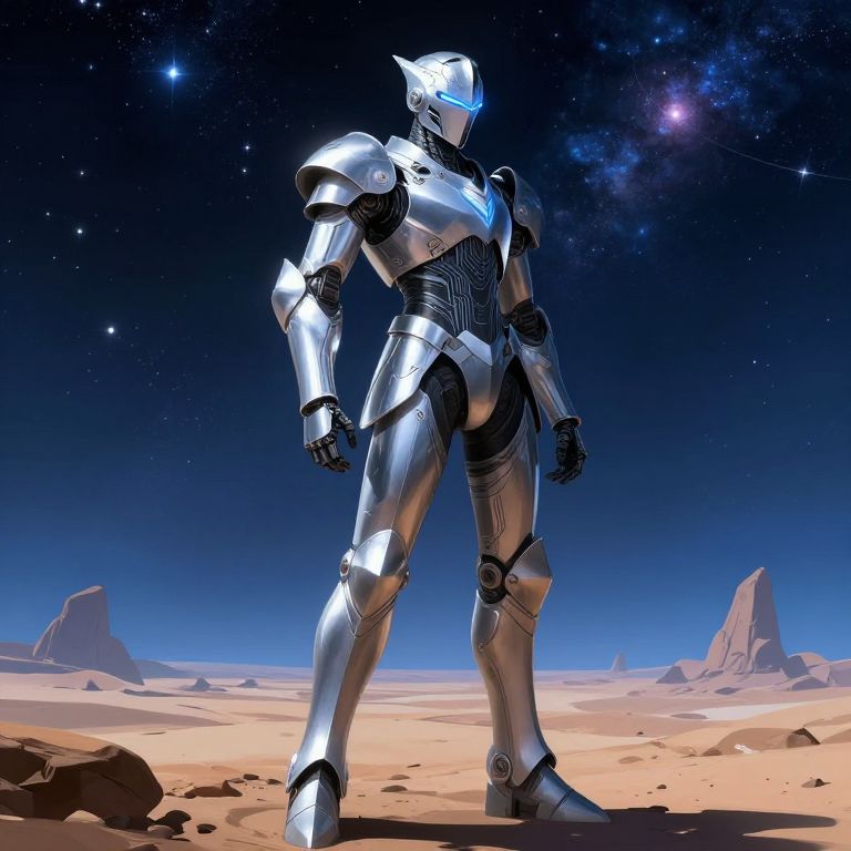 Digital illustration of a futuristic, silver metallic humanoid robot standing in a desert landscape under a starry night sky. The robot has a sleek, armor-like design with glowing blue accents on its chest and head. Its arms and legs are articulated, and it has a streamlined, aerodynamic build. The background features distant, jagged rock formations and a vast, sandy desert. The sky is deep blue, dotted with stars, and a faint Milky Way is visible. The robot's stance is strong and imposing, with its head slightly tilted, as if surveying the surroundings.