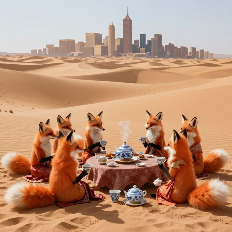 Digital artwork depicting five anthropomorphic foxes with orange fur and white underbellies, seated around a round table in a vast desert with rolling sand dunes. The foxes, dressed in red garments, engage in a tea party with blue and white porcelain teacups and a teapot on a tablecloth. In the background, a city skyline with tall buildings is visible under a clear blue sky. The foxes' tails are bushy and white-tipped, and they sit in a semi-circle, facing the table. The overall style is whimsical and surreal.