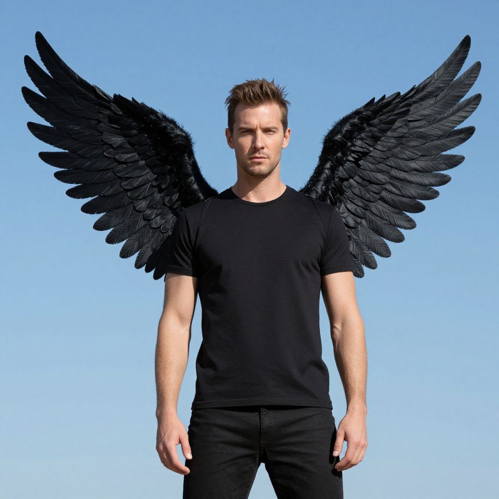 "Wings Costume Adult, man with wings on his head standing in front of a blue sky"