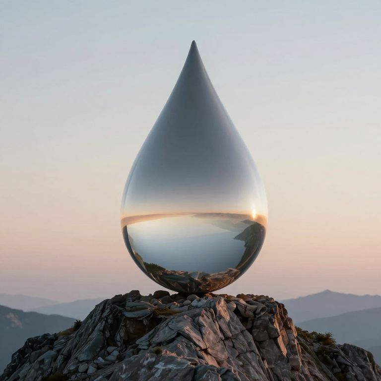Photograph of a large, perfectly clear glass teardrop sculpture balanced on a rocky peak at sunrise. The teardrop reflects the sunrise, creating a shimmering, mirrored effect. The background shows a gradient sky from pale pink to light blue, with distant, faintly visible mountain ranges. The rocks are textured and rugged, contrasting with the smooth, reflective surface of the teardrop. The image captures a serene, almost ethereal atmosphere, highlighting the teardrop's delicate balance and the natural beauty of the landscape.