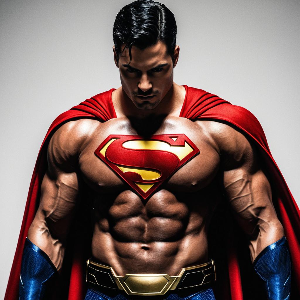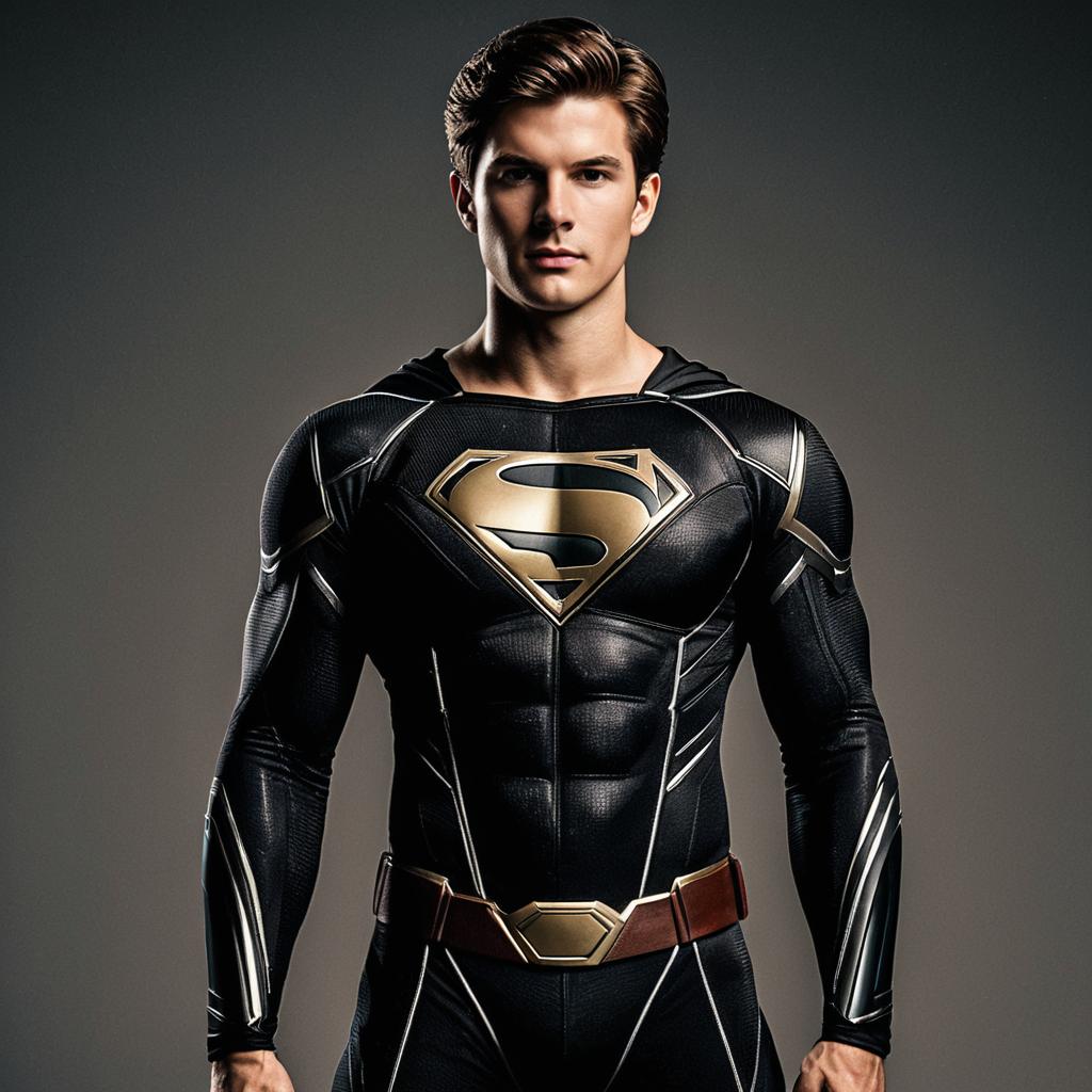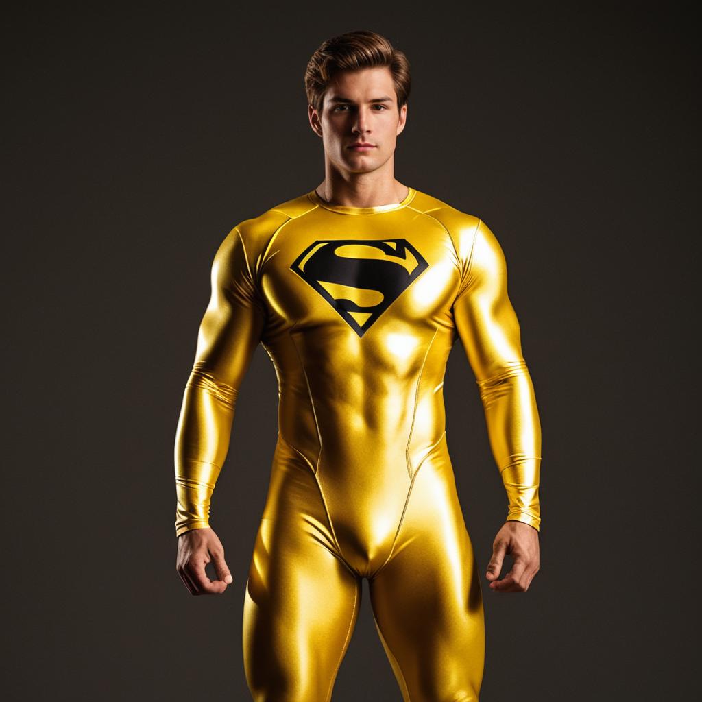 Portrait of a muscular young Caucasian male superhero wearing a tight white bodysuit featuring a gold emblem on his chest and a red cape. He has short brown hair, a serious expression, and is looking directly at the camera against a blurred dark gray background.