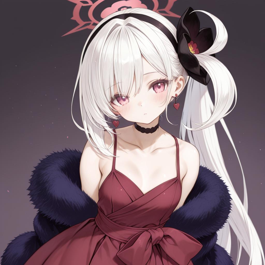 Digital anime-style drawing of a young woman with long, white hair and pink eyes. She wears a red, spaghetti-strap dress with a large bow at the waist, and a black choker. A black, fur-trimmed coat drapes over her shoulders. A black hair accessory with a red flower is on her right side. Her expression is neutral, and she has small, red heart-shaped earrings. The background is a gradient of dark purple to black with a glowing red halo-like design above her head. The overall style is cute and elegant.