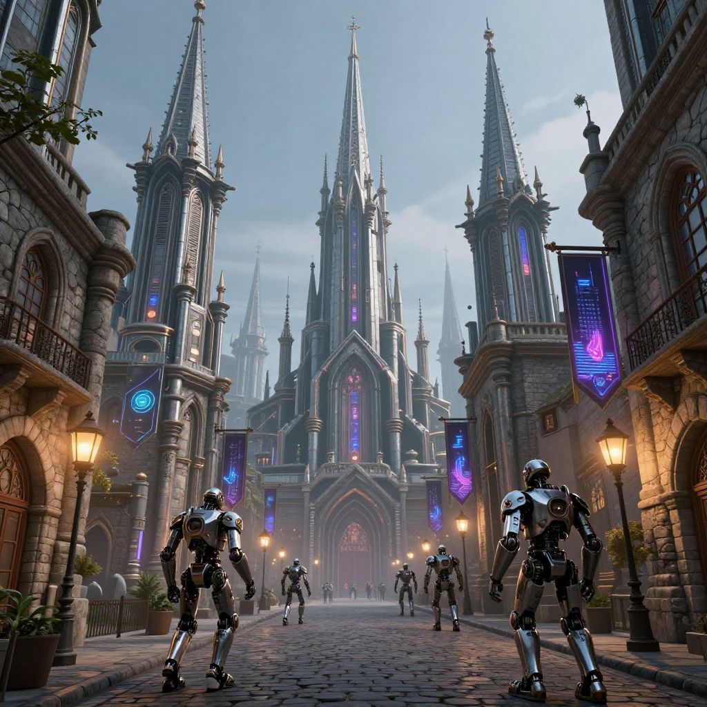 Medieval futurism inspired cityscape featuring towering spires made of metal and stone, with robotic sentries patrolling ancient cobblestone streets lit by neon lanterns, blending classic gothic architecture with advanced cybernetic enhancements and digital banners.