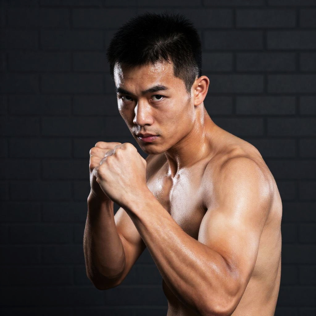 Muscular shirtless man performing a high kick against a bright orange sun backdrop. He wears black pants with a red waistband and white socks. His face shows intense focus. The sun's glow surrounds him, creating a dramatic contrast.