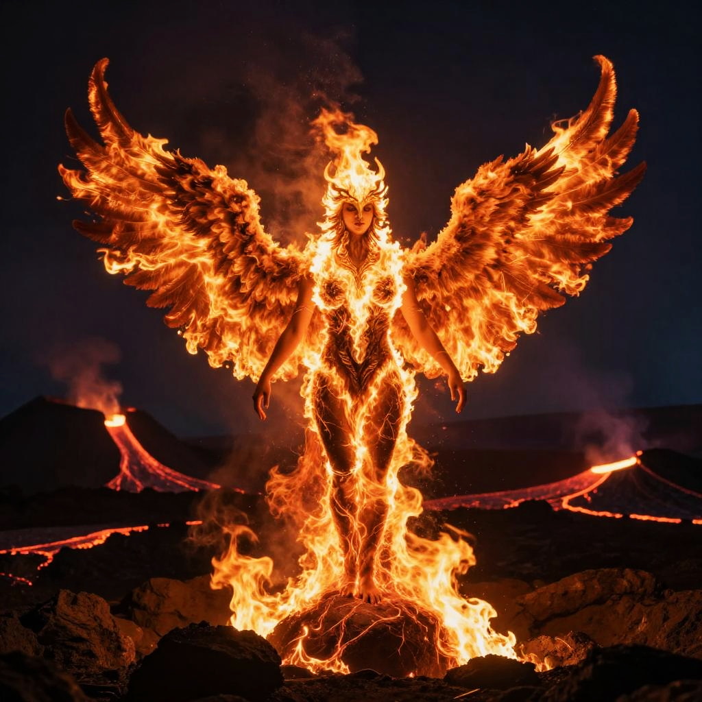 Pele – Goddess of volcanoes and fire, portrayed as a radiant phoenix-like deity wreathed in flames, wings spreading wide with blazing intensity, standing in the barren volcanic wasteland at night, lit only by the pulse of flowing lava rivulets and distant stars.