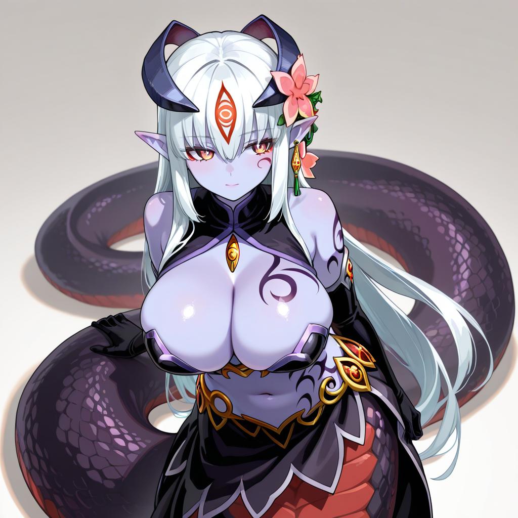 Alipheese fateburn xvi, mon-musu quest!, 1girl, purple skin, pointy ears, horns, yellow eyes, hair between eyes, eye tattoo, white hair, very long hair, long hair, hair tattoo, hair flower, large breasts, breast tattoo, navel, stomach tattoo, facial tattoo, elbow gloves, black gloves, black skirt, lamia, scales, single earring, by artist shiden (sashimi no wife), illustrious