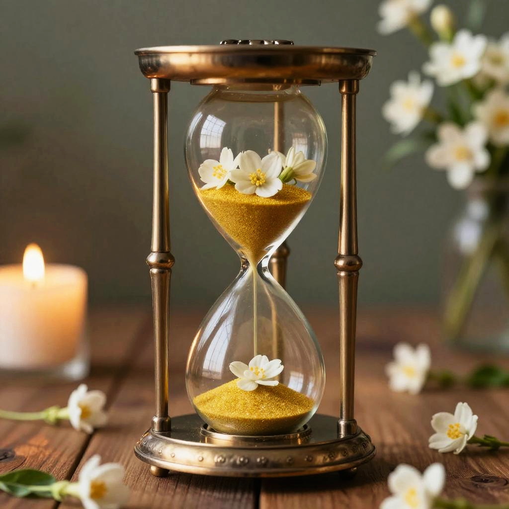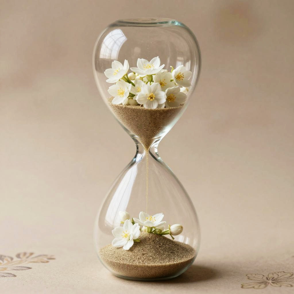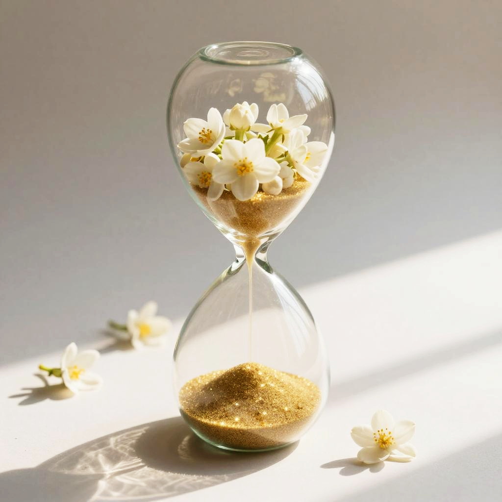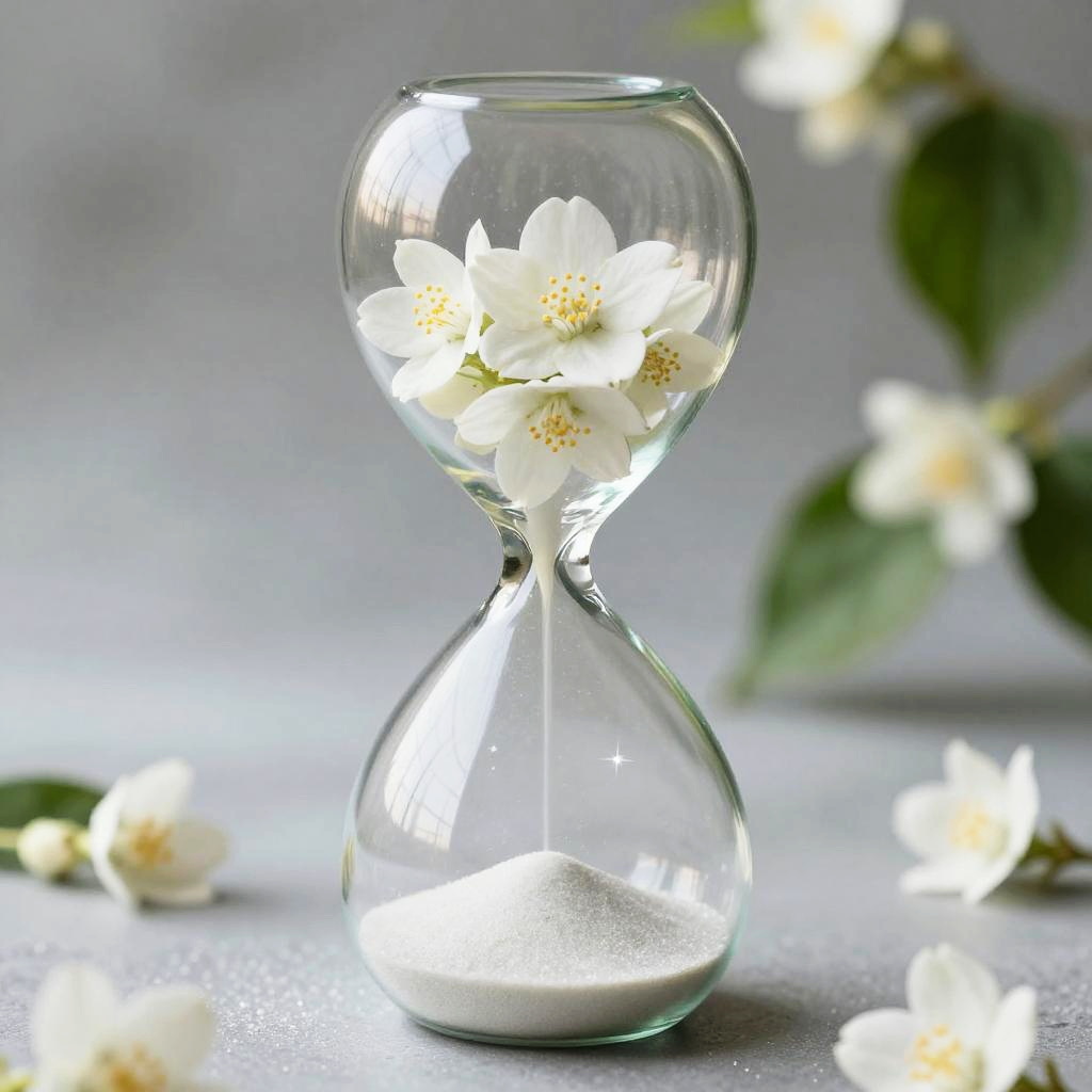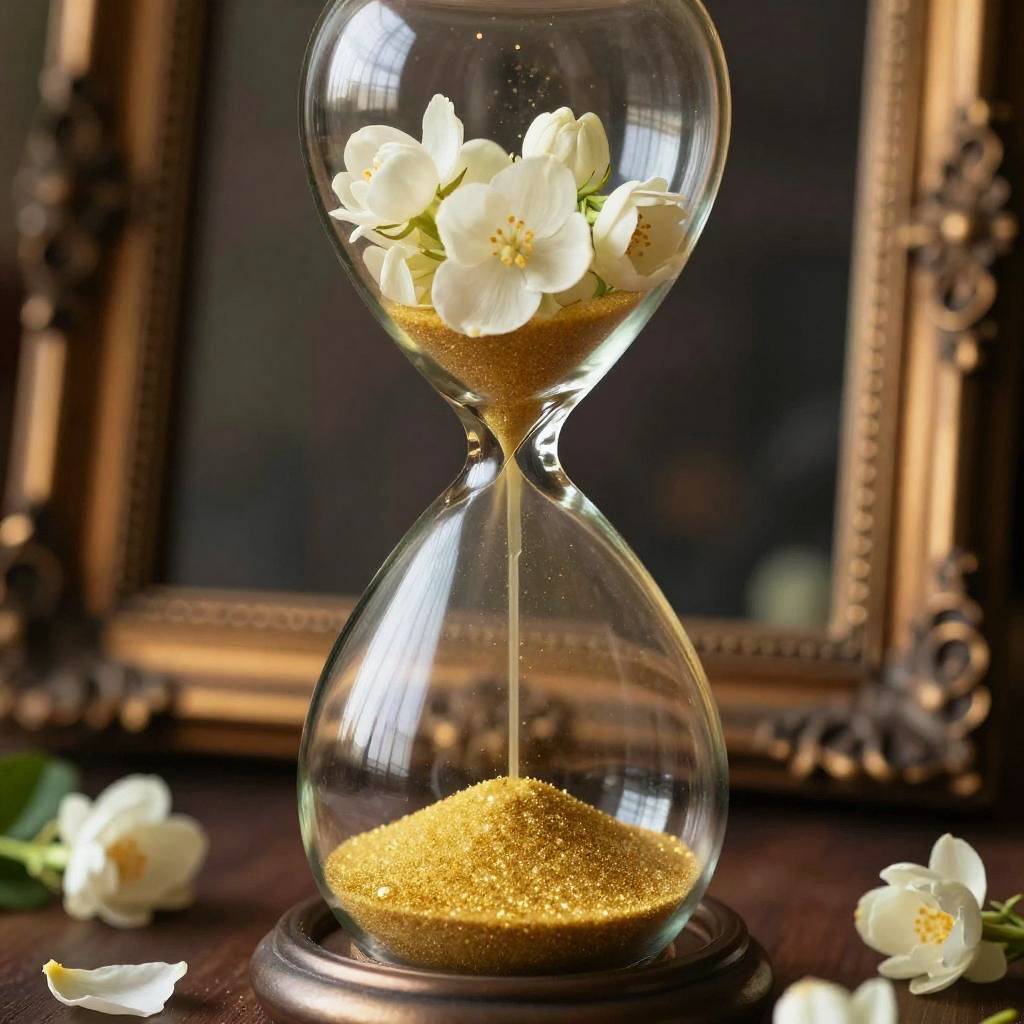 Jasmine in hourglass, delicate white jasmine flowers cascading inside a transparent vintage hourglass, golden sand flowing slowly around the blossoms, soft warm lighting, ethereal background with subtle floral motifs, surreal and tranquil atmosphere, high detail