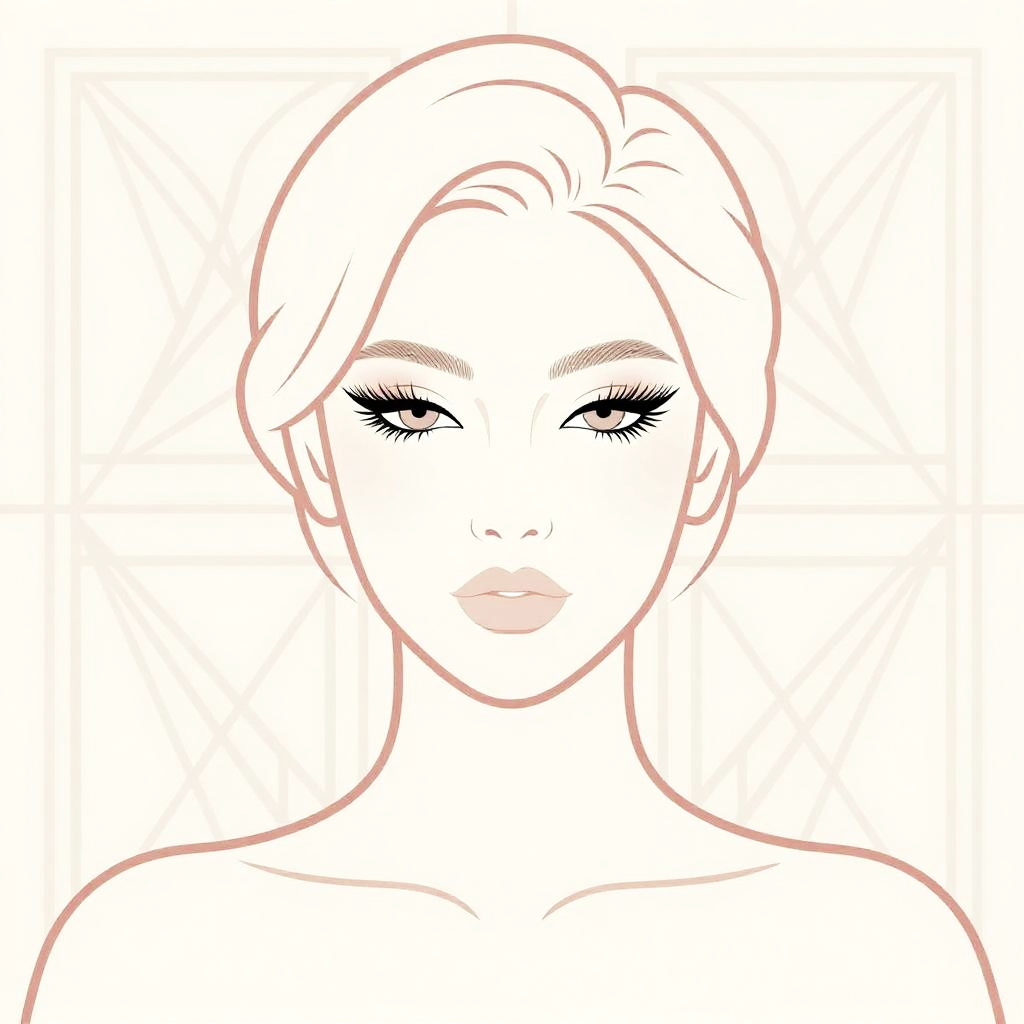 Realistic photo.Minimalist portrait of glamour woman, outlined in rose and ivory tones, stylized eyelashes, geometric background with subtle leaf patterns, art deco inspired, elegant and feminine aesthetic, soft lighting, high contrast, vintage illustration style. realistic photo