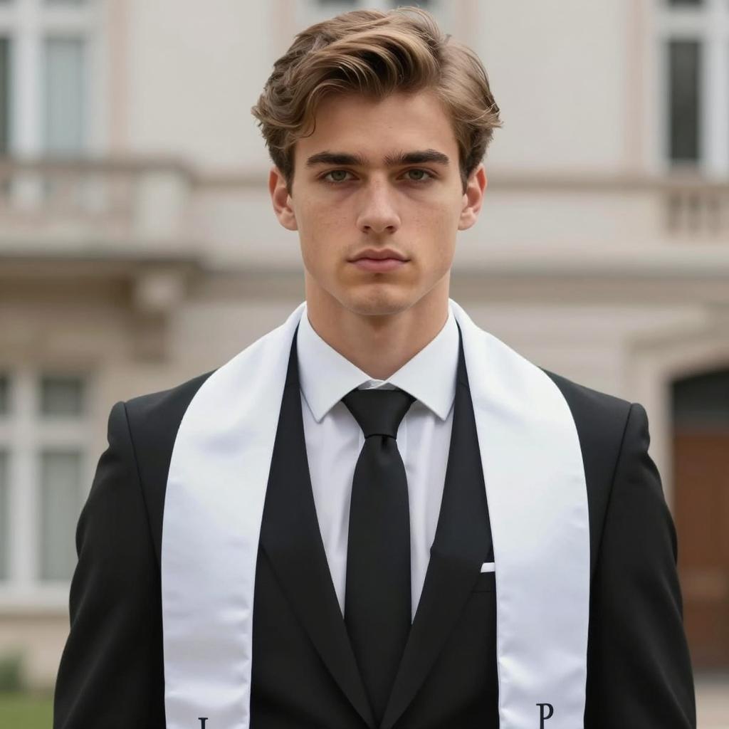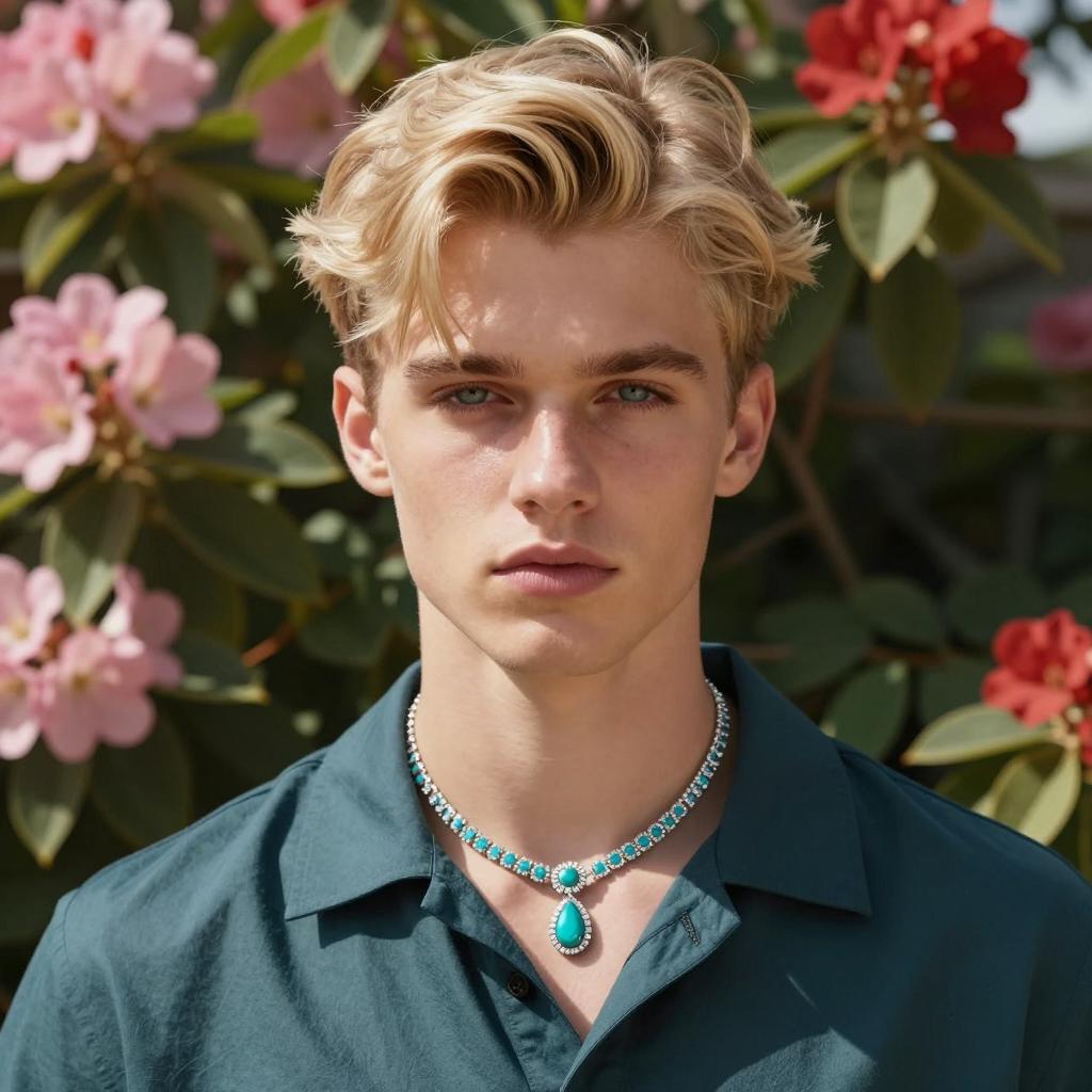 Concert outfit male, photorealistic portrait of a young man with fair skin, short brown hair styled up, green eyes, wearing a black blazer over a black ribbed shirt, standing in a garden with pink flowers in the background, sunlight, clear sky, slightly serious expression, medium close-up, daytime, summer, vibrant colors, detailed ures, realistic lighting, well-groomed appearance, fashionable outfit, elegant style