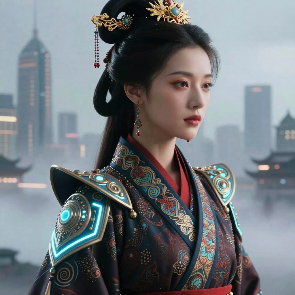 Digital artwork of an Asian woman with fair skin and delicate features, dressed in an ornate, traditional Chinese robe adorned with intricate, colorful patterns and metallic shoulder guards. Her black hair is styled in an elaborate updo with gold and red floral hairpieces. She wears red lipstick and dangling earrings. The background depicts a misty, modern cityscape with tall, illuminated buildings and traditional pagodas, blending East and West elements. The overall style is realistic with a fantasy touch, emphasizing both cultural heritage and futuristic elements.