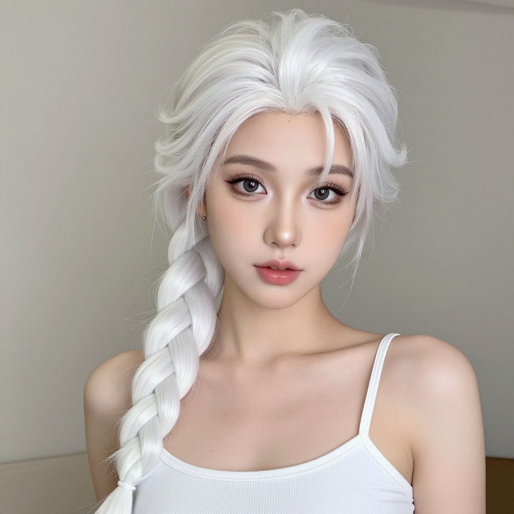 Photograph of an Asian woman with fair skin and long, white, braided hair. She has large, almond-shaped gray eyes, full lips with a natural pink hue, and a slender neck. She's wearing a simple, white, spaghetti-strap top that reveals her shoulders. The background is a plain, light-colored wall, and the lighting is soft, highlighting her hair and face. The image has a slightly digital, airbrushed look, giving her skin a smooth texture. Her expression is neutral, with a slight, closed-mouth smile. The overall style is modern and minimalist.