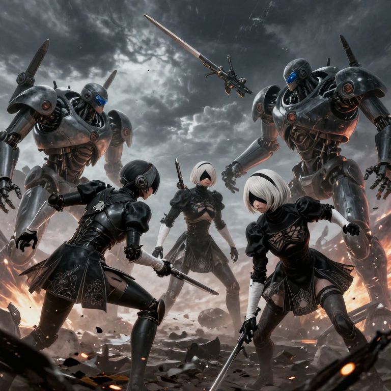 Nier concept art focused on a battle scene featuring robotic enemies and humanoid characters with detailed armor and weaponry, dynamic poses under a stormy sky, vibrant sparks and debris flying, with a cyberpunk and post-apocalyptic aesthetic.