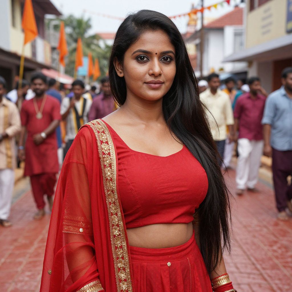 A high-resolution photo of a woman with full, naturally shaped face, deep brown skin, and long black hair flowing down her back, dressed in a bold red chaniya choli with gold zari detailing, standing on a red-tiled street in a South Indian neighborhood during a cultural parade, with flags and music instruments in the background.. The woman has big breasts and cute face