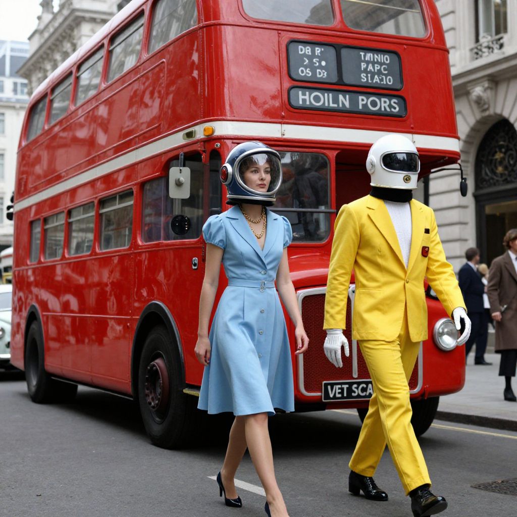 In the heart of 1975 London, a scene unfolds where the ordinary meets the extraordinary. A woman emerges from a vibrant red double-decker bus, her head adorned with a futuristic helmet that resembles a space-age visor. She is dressed in a light blue dress, her outfit complemented by a gold necklace that adds a touch of elegance to her otherwise unconventional attire. To her right, a robot in a striking yellow suit strides confidently, its white helmet and gloves contrasting sharply with its colorful ensemble. In the background, a classic car and a grand building with intricate architectural details frame the scene, hinting at the blend of the past and the future. The juxtaposition of these elements paints a vivid picture of outer space visitors on a leisurely stroll through the city, creating a surreal and captivating snapshot of a time when science fiction and reality intersected.