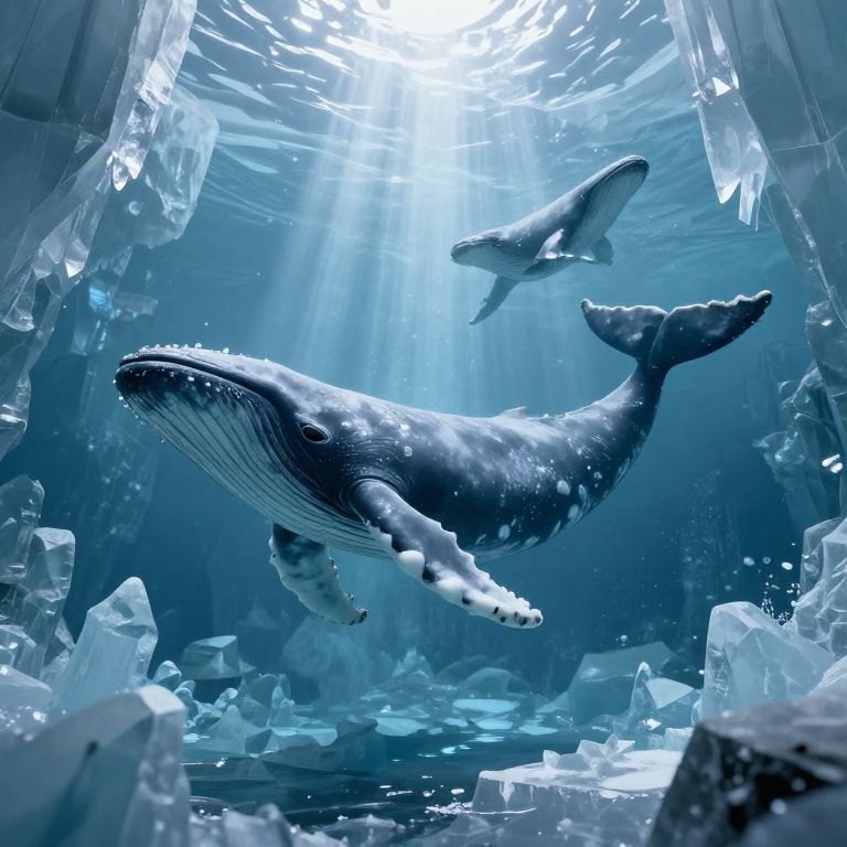 Trapped within a crystalline prison of ice and time, ancient whales hover in eternal suspension, their frozen forms a haunting testament to the fragility of life and the relentless march of transience.