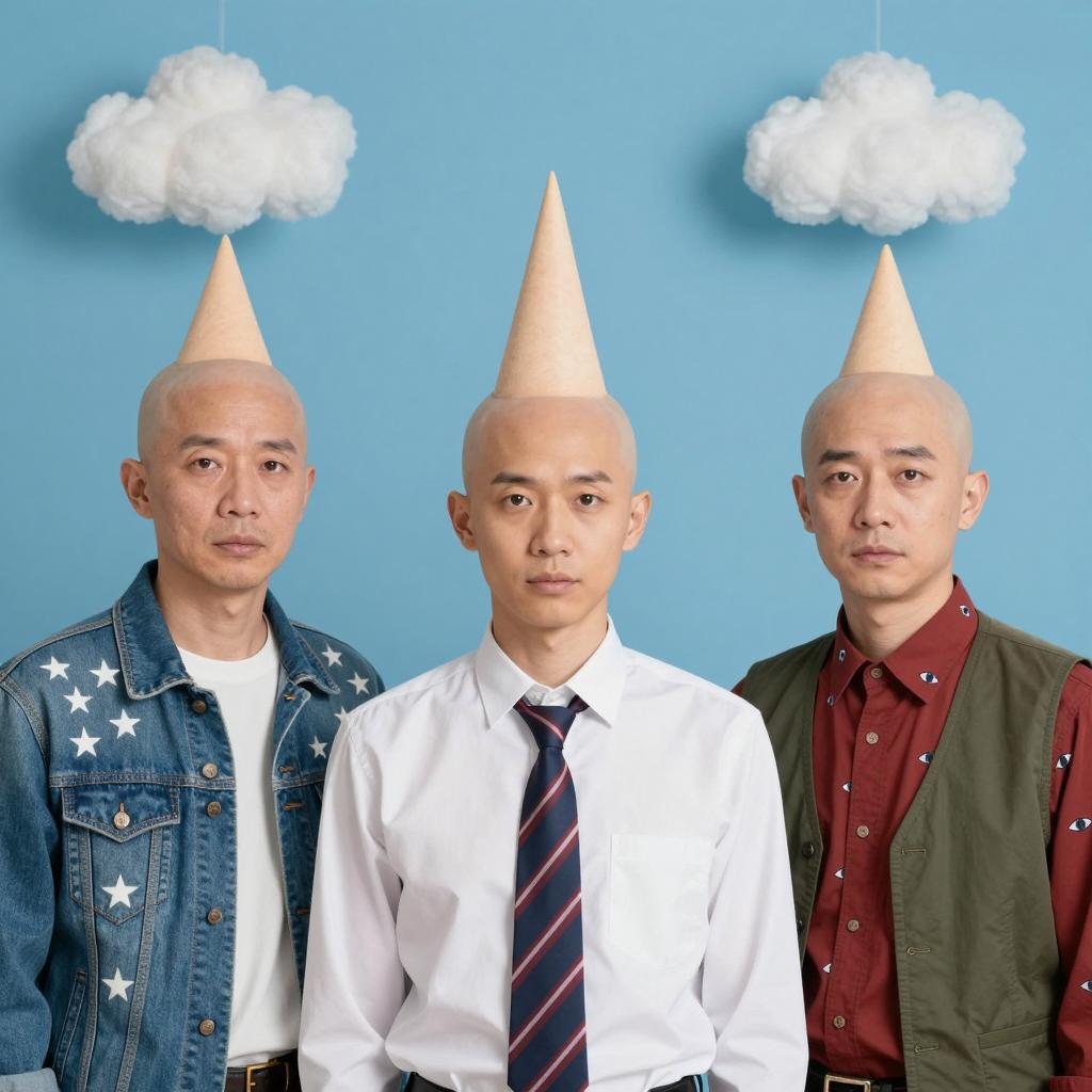 Three bald individuals with large, cone-shaped heads stand against a bright blue sky with two white clouds. The left person wears a denim jacket with white stars, the center person wears a white shirt and striped tie, and the right person wears a red shirt with eye patterns and a green vest. All three have neutral facial expressions.
