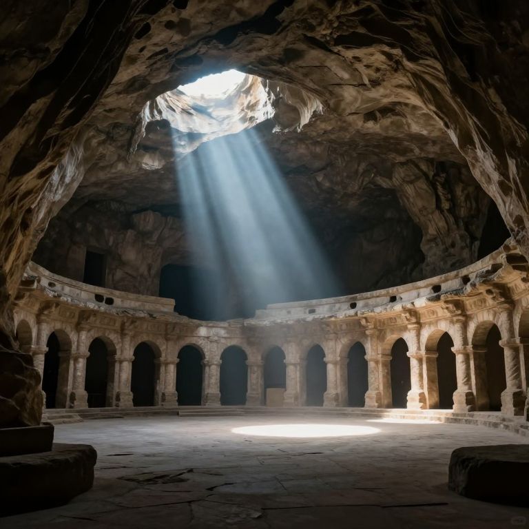 An ancient cavernous arena whispers forgotten symphonies, its stone walls resonating with the melancholic echoes of bygone eras, while beams of ethereal light pierce the void, casting a serene yet haunting glow over the silent, timeless expanse.