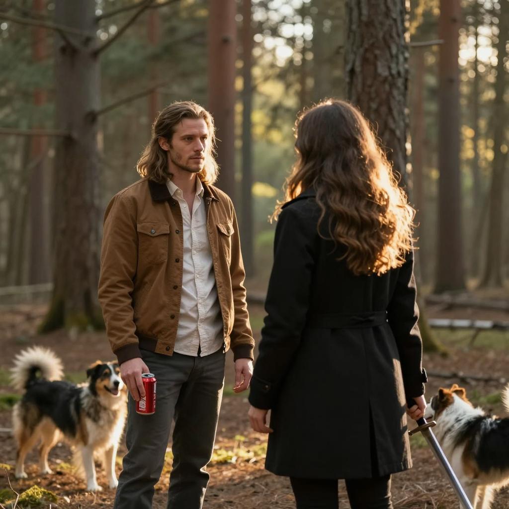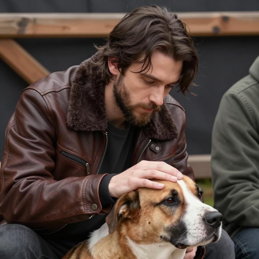 Man with medium-length dark brown hair and beard, wearing a brown leather jacket with a fur collar, gently pets a brown and white dog with a black snout. The man has a focused expression. Background includes wooden beams and dark fabric. Man's left hand rests on the dog's head. Two people, man and dog.