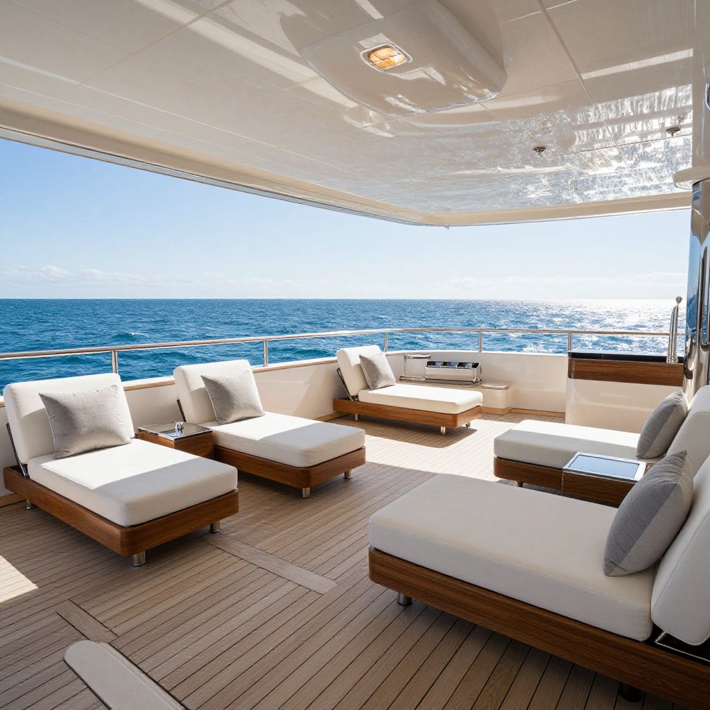 Spacious luxury yacht deck with polished wooden floors, comfortable lounge chairs, and panoramic ocean views, clear sunny day with gentle waves, modern design blending elegance and comfort, perfect for relaxation and entertainment.
