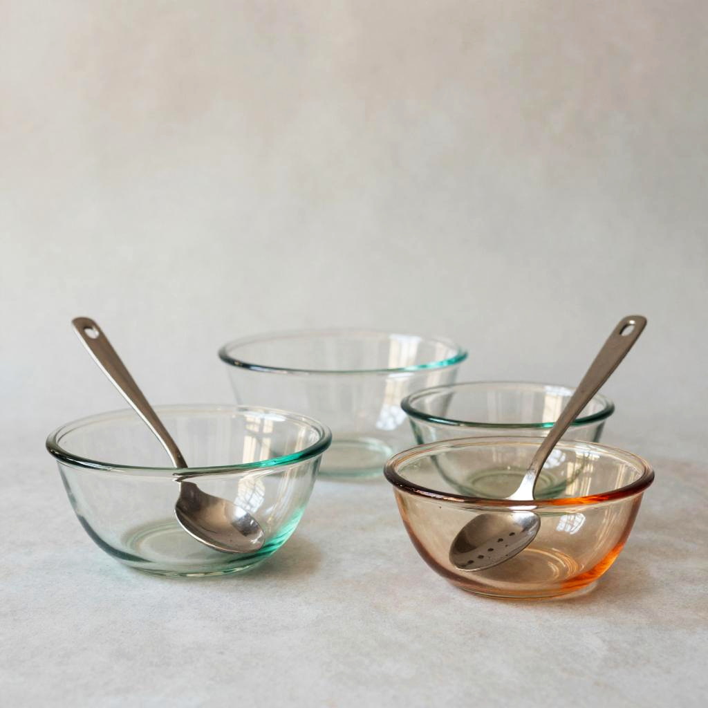 An artistic still-life composition featuring vintage Pyrex bowls and kitchen utensils, set against a textured pastel background, soft diffused lighting emphasizing the smooth curves and vibrant hues of the glassware for a nostalgic feel.