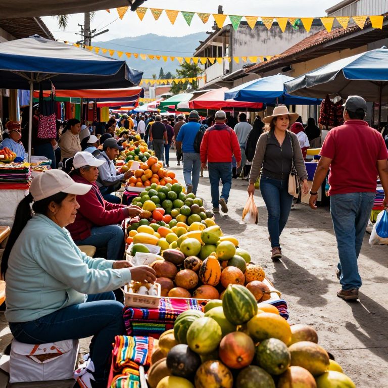 Colombian street market bustling with colorful fruits, vivid textiles, lively vendors, festive atmosphere, early morning light casting long shadows, detailed textures, realistic yet vibrant and inviting scene