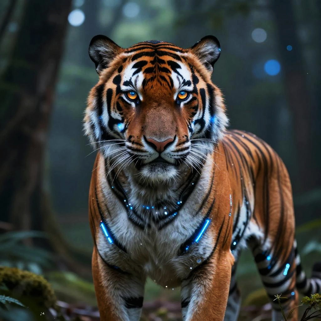 AI tiger, portrait of a sleek robotic tiger in a glowing techno-forest, the ambient light reflecting off its metal fur with electric blue and orange hues, eyes scanning the environment with advanced sensors, combining realism with futuristic aesthetics.