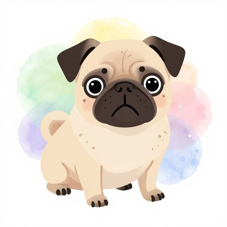 Simon Stalenhag cute pug wallpaper, background, pug, 2D vector, colorful, what kids like, watercolor draw style,
