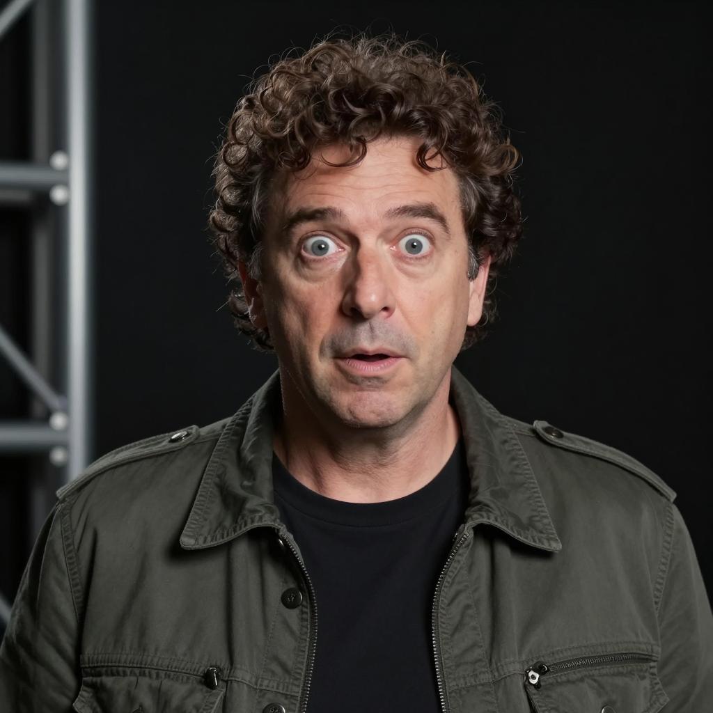 Middle-aged man with curly brown hair and light skin, wearing a dark green jacket over a black shirt. His face shows surprise with wide eyes and slightly parted lips. Dark background with a blurry metallic structure on the left. Low lighting emphasizes his facial features and jacket ure.