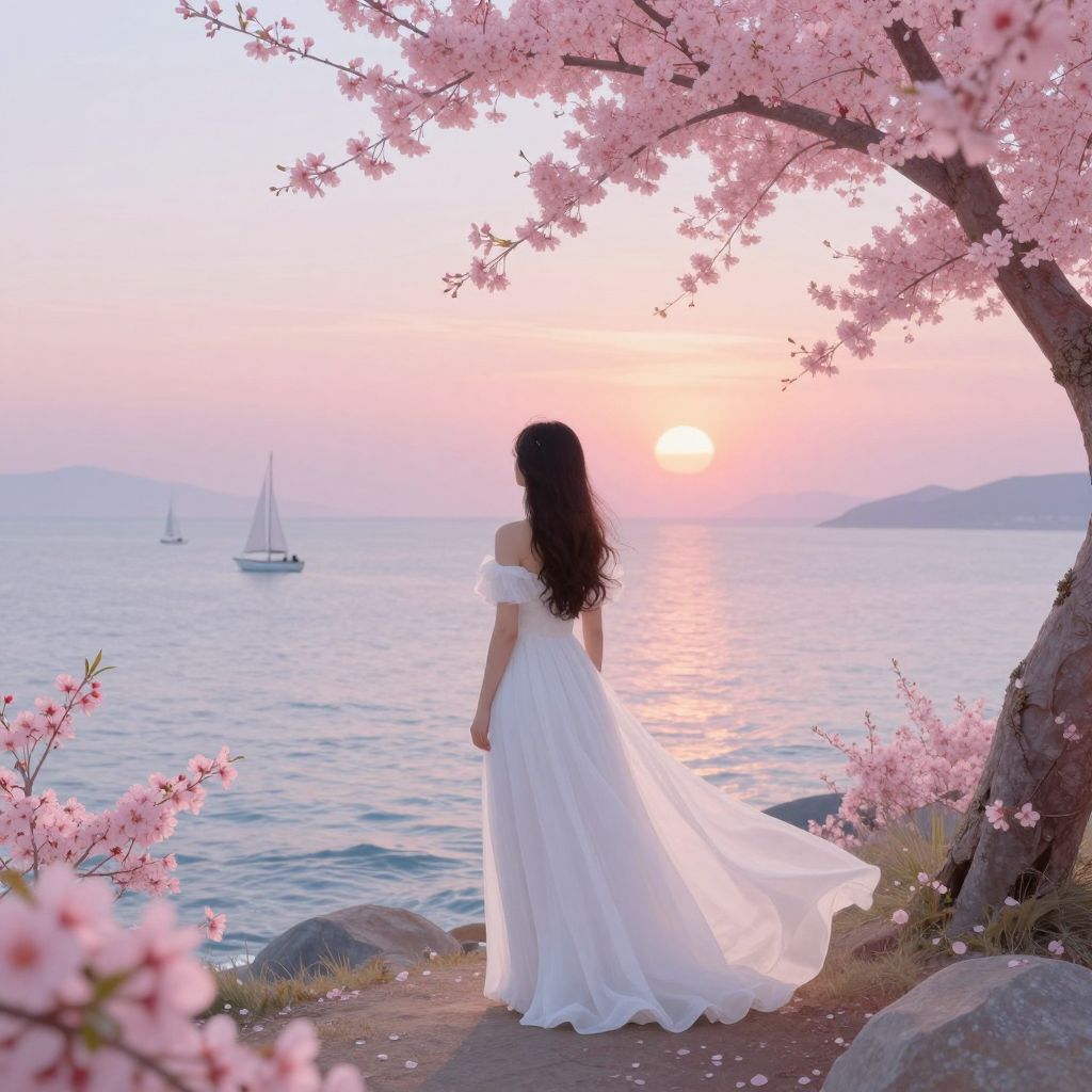 A serene digital artwork captures a woman in a flowing white gown standing amidst vibrant pink blossoms, gazing at a tranquil sunset over a calm sea dotted with sailboats, rendered in high-definition detail with a dreamy, magical ambiance reminiscent of impressionist landscapes.