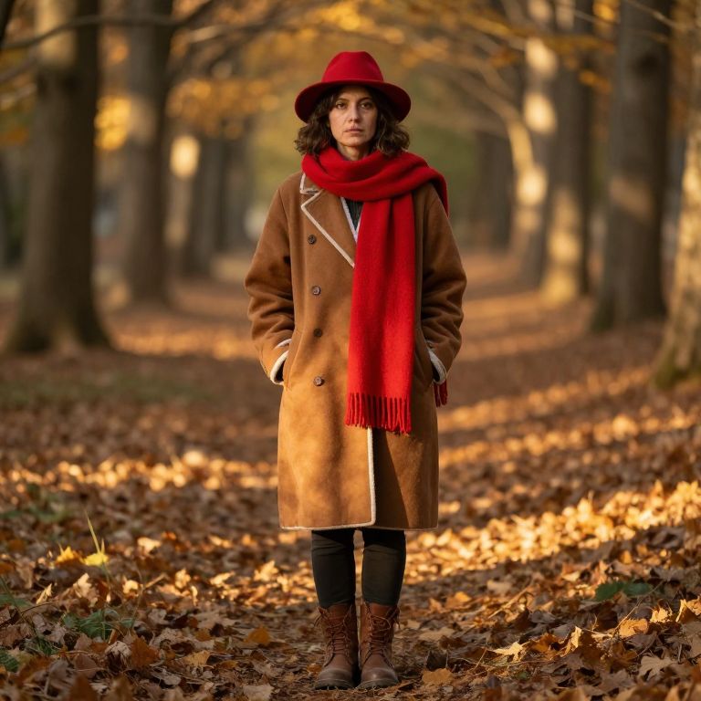 A person stands in a autumnal forest setting, wearing a warm brown coat with a white trim, a bright red hat that slightly tilts to one side, a cozy red scarf wrapped neatly around their neck, and sturdy brown boots that match the coat. The person has a slightly weathered face with kind, attentive eyes, and their hair is naturally styled in soft, medium-length waves. The golden hour light filters through the trees, casting long shadows and warming the scene, creating a peaceful and inviting atmosphere.