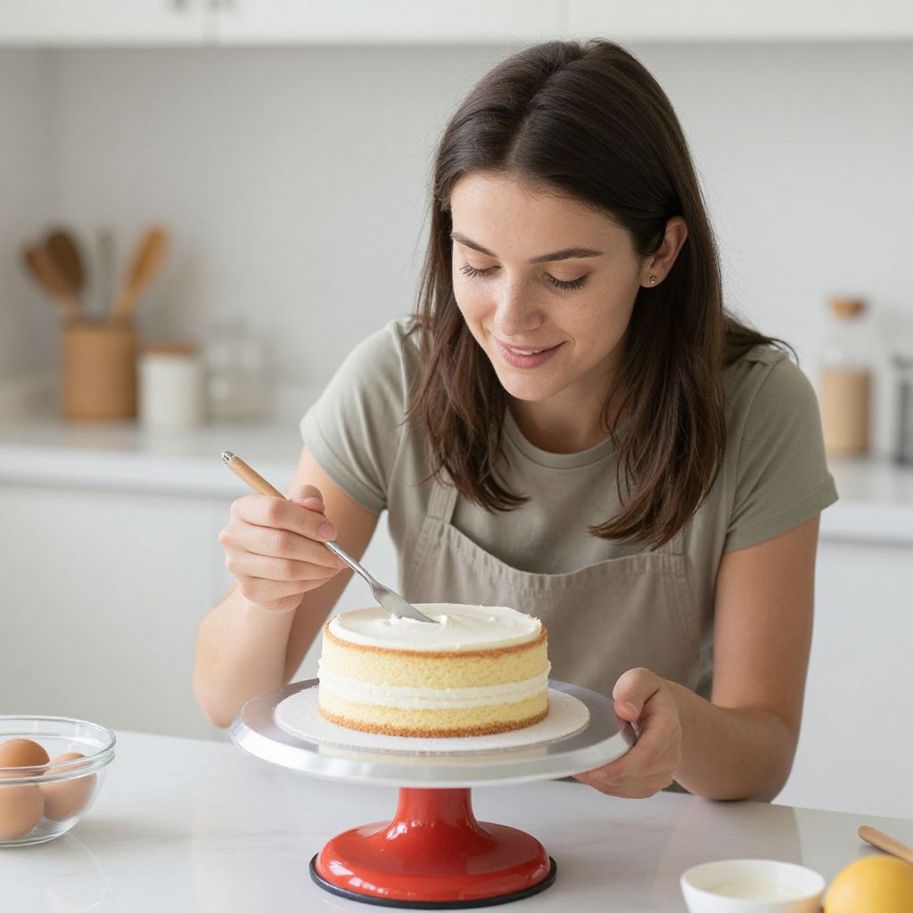 Photograph of a young woman with fair skin and dark brown hair, wearing a light gray t-shirt and white apron, smiling as she frost a two-layered cake on a red cake stand. She holds a spatula in her right hand and a knife in her left. The bright, white kitchen background features blurred utensils and jars. On the white table, there is a glass bowl with eggs and a small dish. Natural light illuminates the scene, creating a warm and inviting atmosphere.