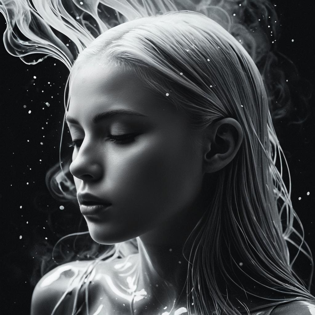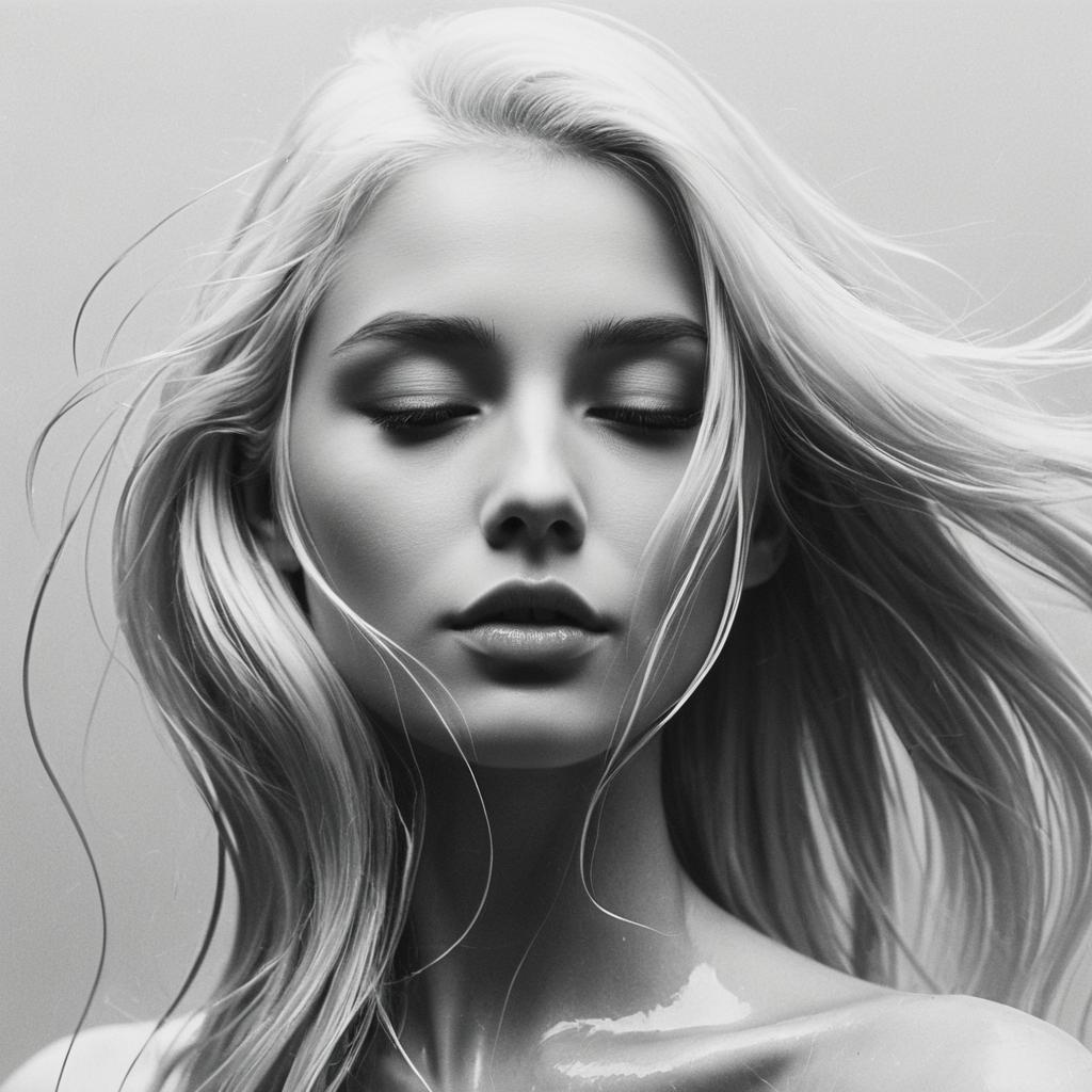 Black and white hyper-detailed close-up portrait of a serene young woman with platinum blonde hair flowing gently, eyes closed, and glossy skin, rendered with a realistic and misty aesthetic.