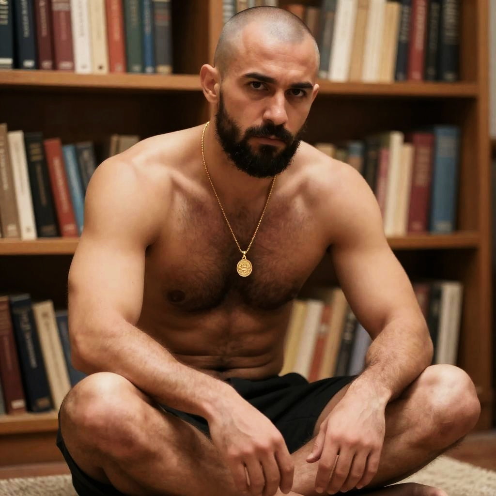 Nude, muscular man with shaved head and beard, seated on floor in front of bookshelf, legs crossed, hands on knees, chest hair, gold pendant necklace, intense expression, bookshelf filled with various books, wooden shelves, indoor setting.