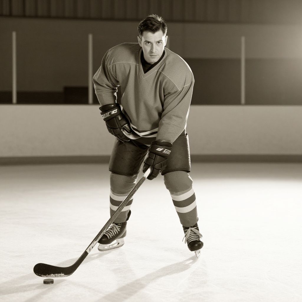 Black-and-white photograph of a serious male ice hockey player in full gear, crouching, holding a stick, on an ice rink.