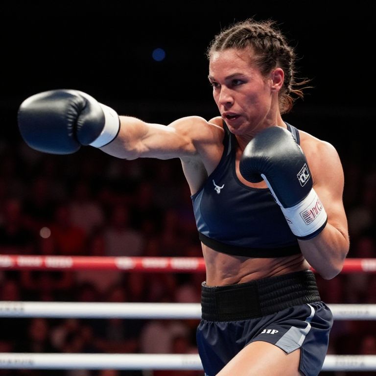 Hottest female boxer delivering a powerful punch during a high-energy match, crowd blurred in background, sharp details on her muscular physique and focused eyes, modern sportswear with sleek design, atmospheric lighting capturing raw athleticism