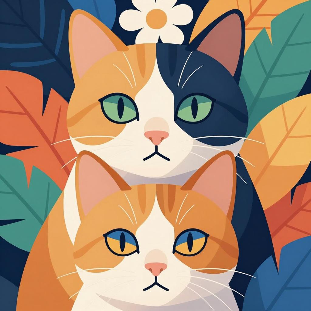 Digital illustration of two cats with vividly colored, abstract facial patterns. Top cat with large, intense green eyes, orange and black fur. Bottom cat with blue and orange eyes, orange and white fur. Background filled with layered, colorful leaves. Cats' faces overlap slightly. Bold, vibrant colors. Flowers above top cat's head. Cats' expressions are calm and focused.