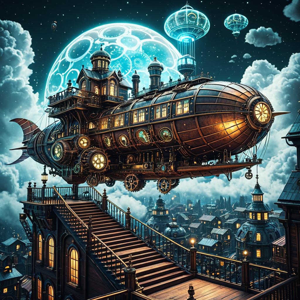 Highly detailed 3D holographic art of a steampunk airship illuminated with glowing blue windows, docked above a cloud city with intricate gears and cogs. The airship is connected to a house by a glowing staircase, set against a backdrop of dramatic clouds and a starry sky. The design features brass and copper mechanical elements with a futuristic sci-fi aesthetic.