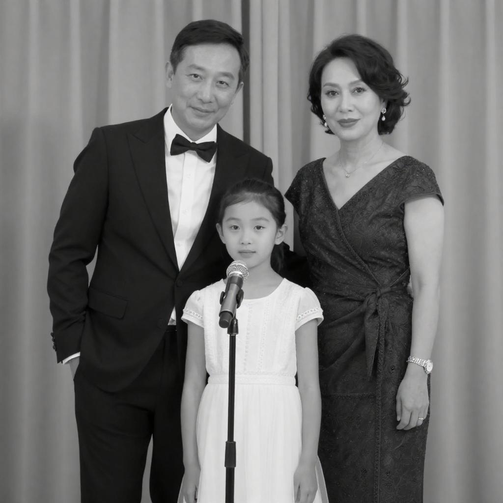 Black-and-white photograph of two people. A man with short, dark hair, wearing a dark suit with buttons, smiles slightly. A boy with short, dark hair, wearing a similar suit, looks to the right with an open mouth. Both have buttoned jackets with round buttons. Background is blurred. The man stands on the left, the boy on the right.