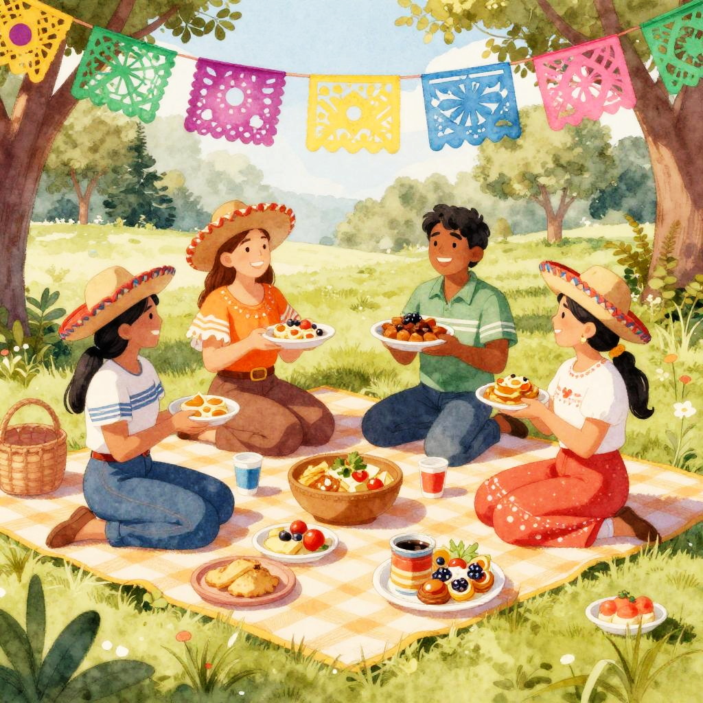 Panzones enjoying a festive picnic in a sunny park, surrounded by delicious Mexican food, traditional decorations like papel picado, soft watercolor style, bright and joyful mood, detailed textures on food and fabric