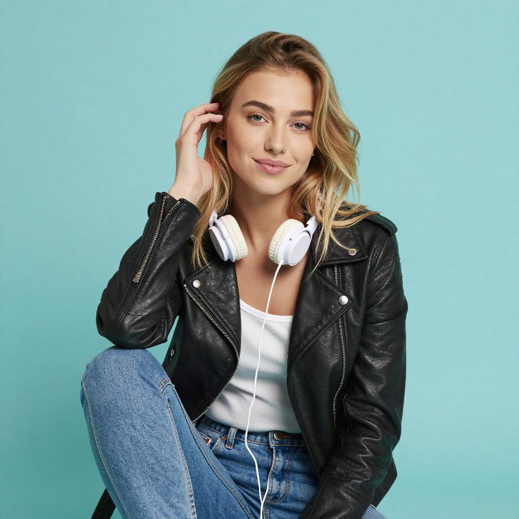 Photograph of a young woman with long blonde hair, wearing a black leather jacket over a white ribbed tank top, and blue jeans. She holds white headphones with both hands, smiling slightly, against a bright turquoise background. Her blue eyes are prominent, and she sits with one knee raised.