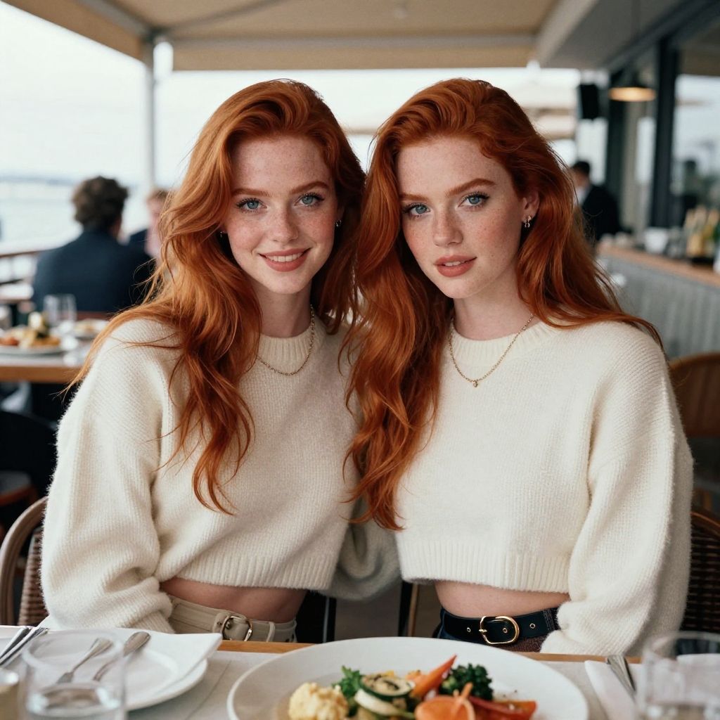 2girls, red hair, photo of gorgeous, (smiling), perfect eyes, highly detailed beautiful expressive eyes, detailed eyes, glamorous hair, (award winning modern photography), (oversized cropped sweater and skirt:1.1), 85mm, (analog, cinematic, film grain:1.3), (A chic, contemporary seafood restaurant, filled with gourmet dishes and a relaxed, seaside atmosphere:1.2), (epiCPhoto), necklace, eyeliner, (looking at viewer:1.2), (cinematic shot:1.3)