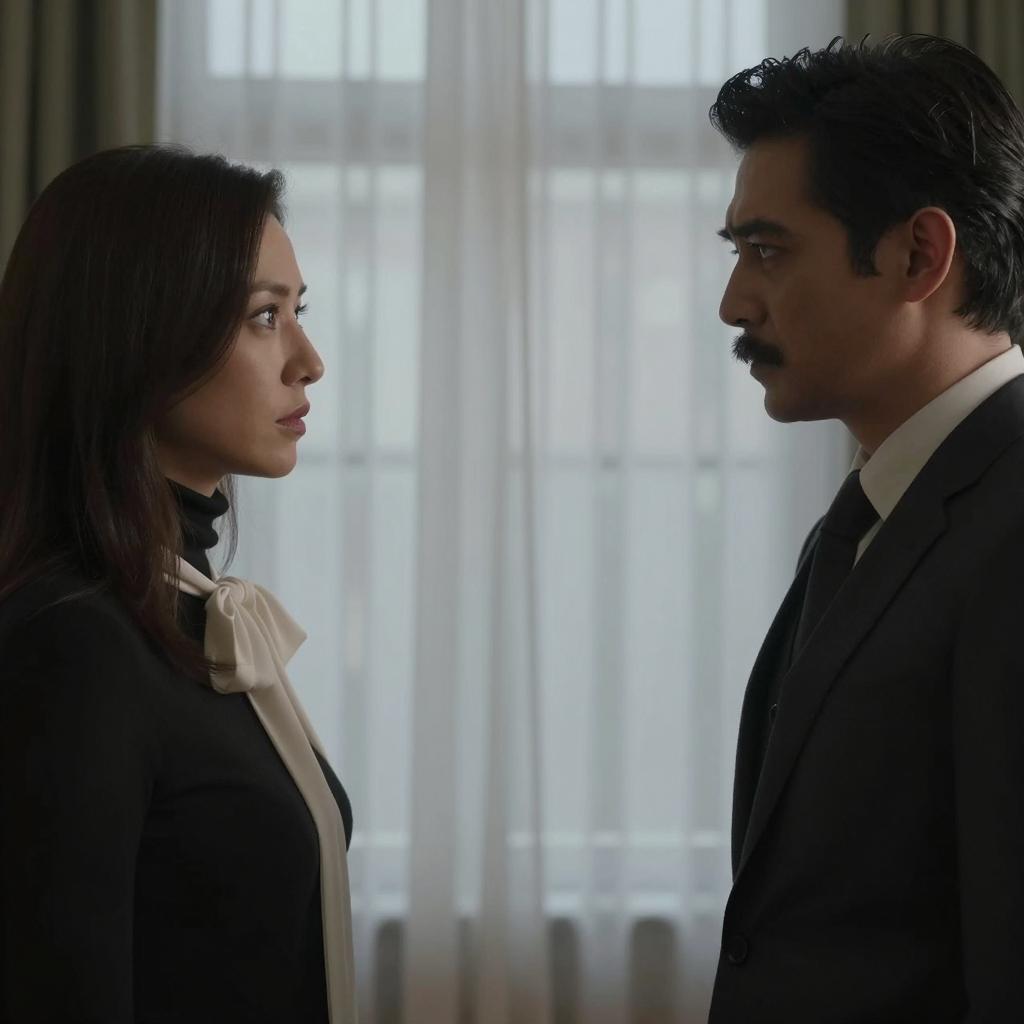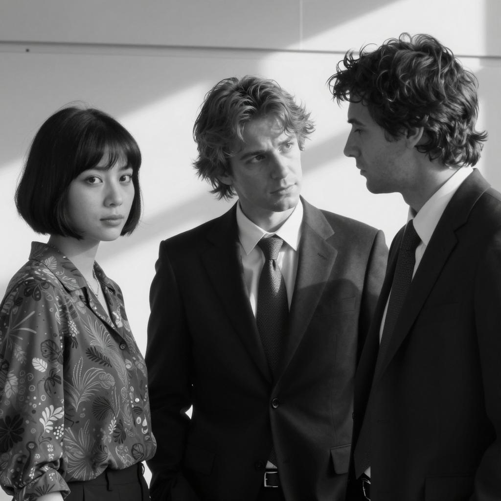 Three people at a table. Woman with short brown hair, blue shirt, black vest, center. Young woman with brown hair, purple shirt, left. Man with brown hair, black suit, white shirt, tie, right. Glasses, water glasses, and floral arrangement on table. Warm indoor lighting, orange wall, lamp in background. Man looks at woman in center, woman gazes forward. Woman on left looks at table.