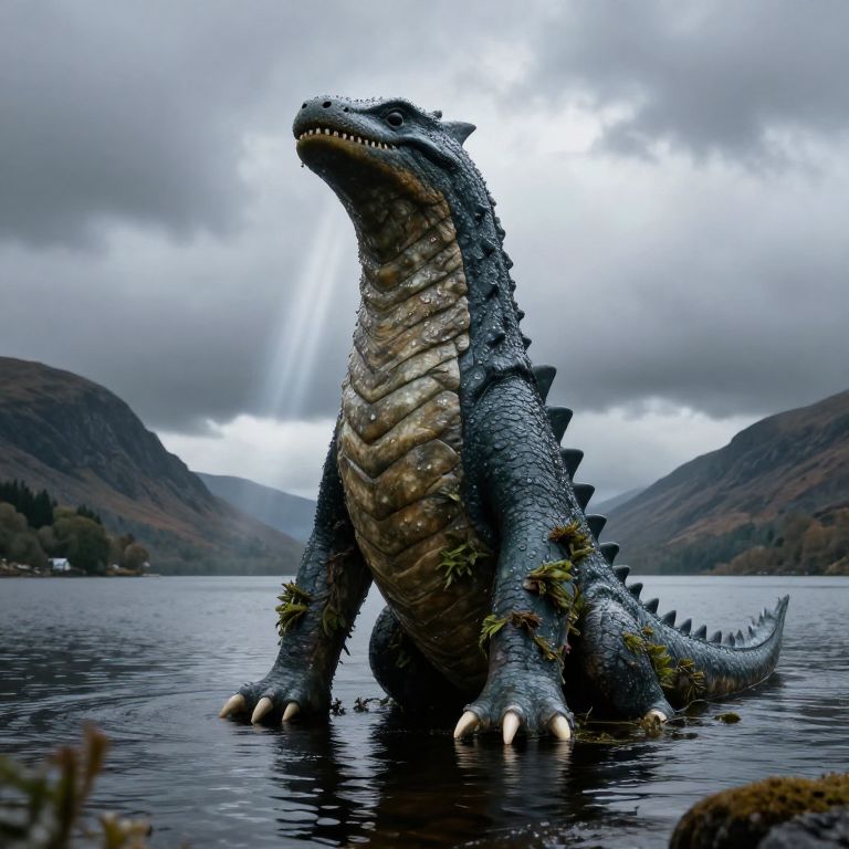 How tall is the Loch Ness Monster visualized as an ancient mythical beast towering above Loch Ness, textured skin glistening with water droplets, aquatic plants clinging to its legs, grand Scottish highlands in the background, with a mysterious light beam breaking through heavy clouds.